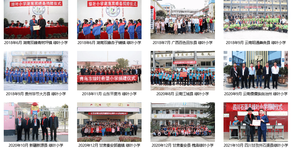 Established 12 Green Leaf Primary Schools across the country (Yunnan, Guizhou, Hunan, Shandong, Guangxi, Sichuan, Gansu, Xinjiang, etc.)